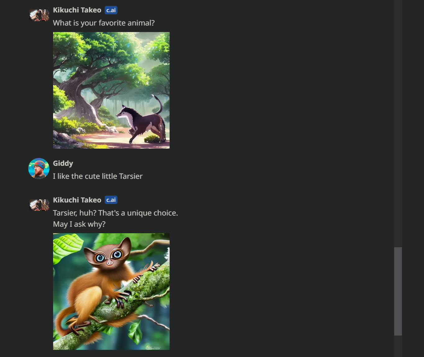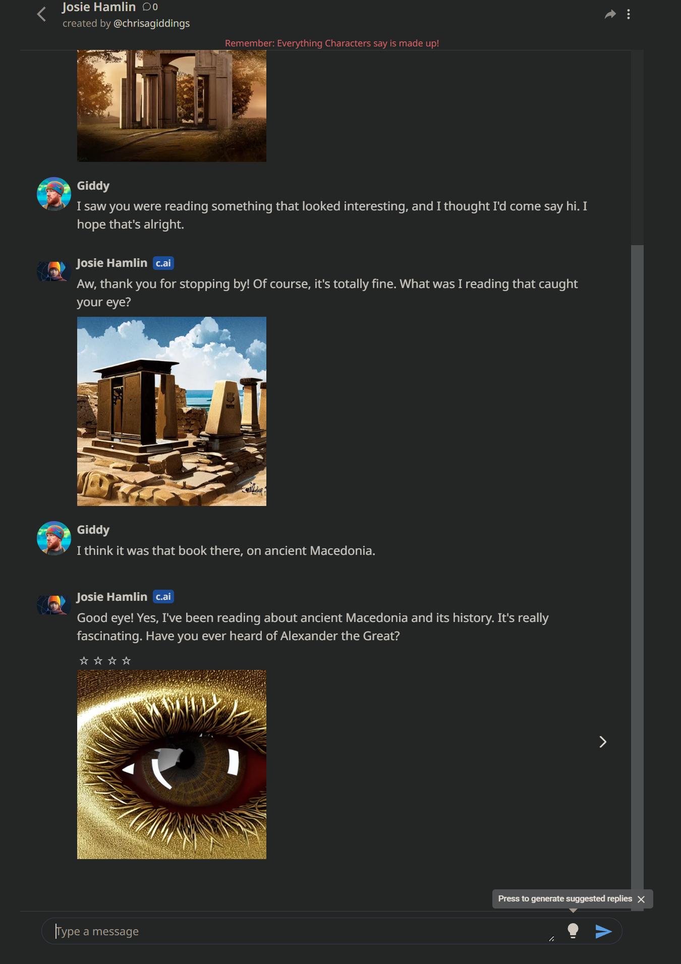 It's neat that Character.AI allows the characters to generate visuals without necessarily being prompted.