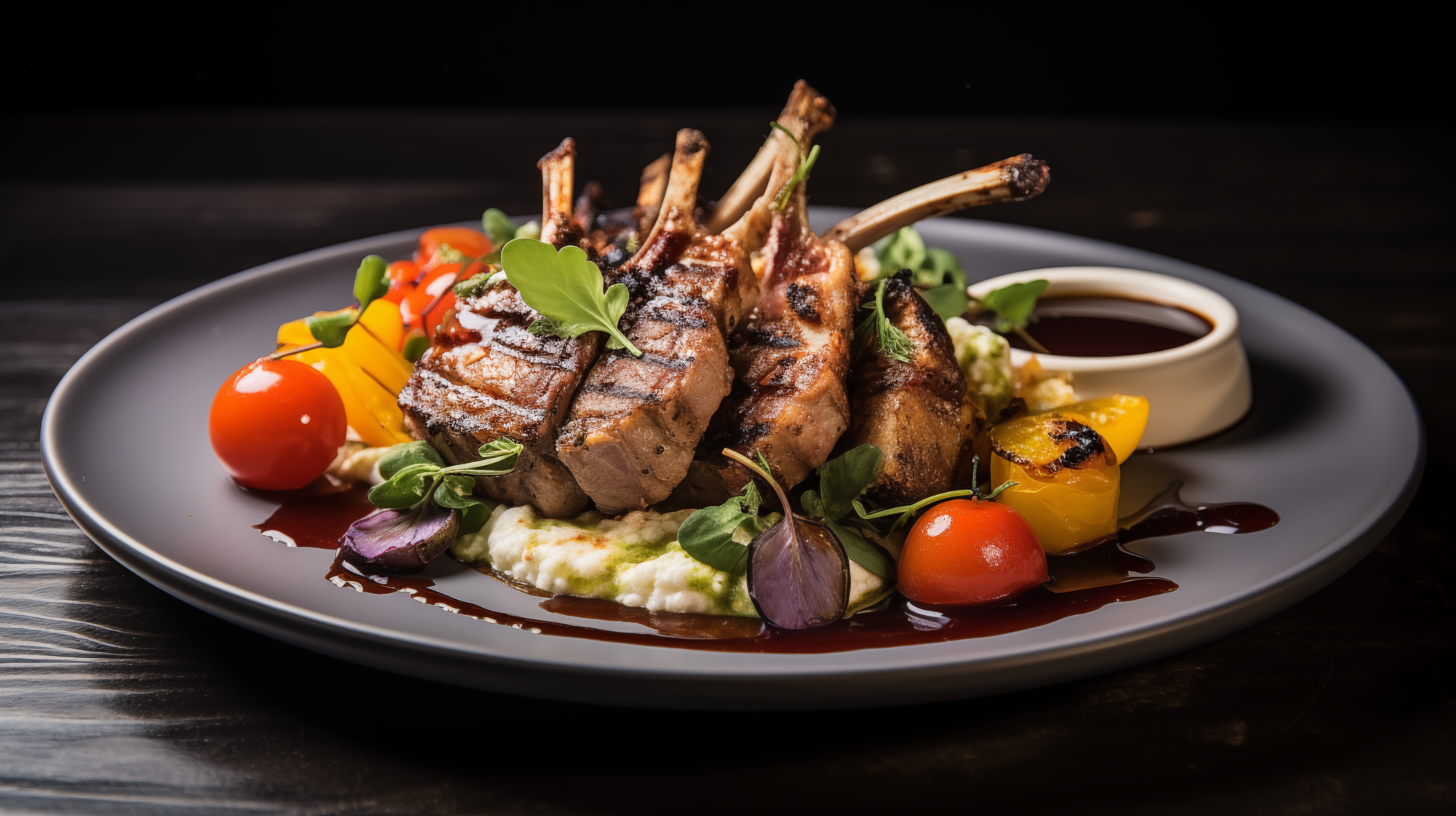 Here's some delicious food. Rack of lamb on a bed of potato puree with mixed veggies and a thickened balsamic reduction.