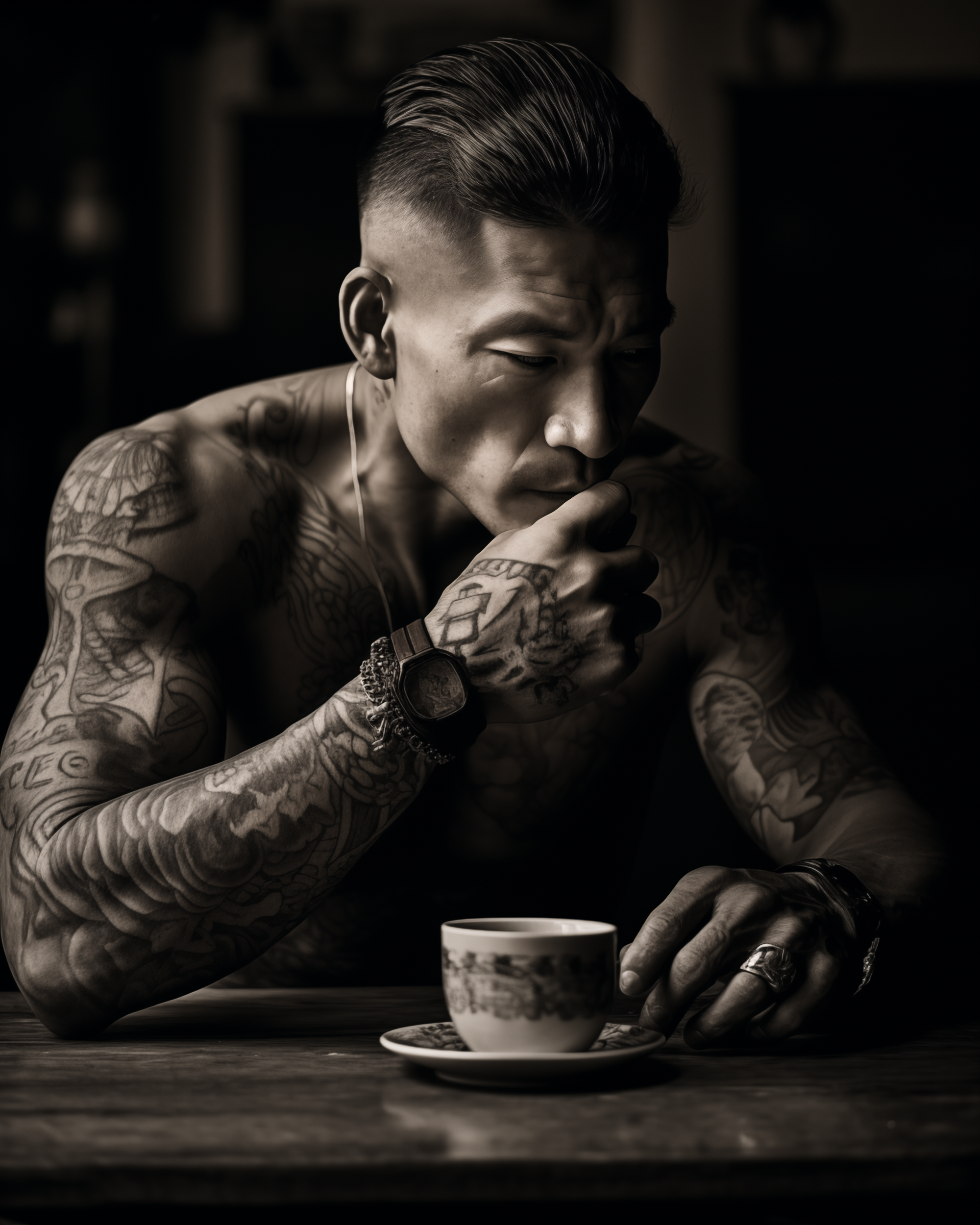 Identical images of a muscular man sitting at a table drinking tea, one at the old maximum resolution, one at the new 4x upscale.
