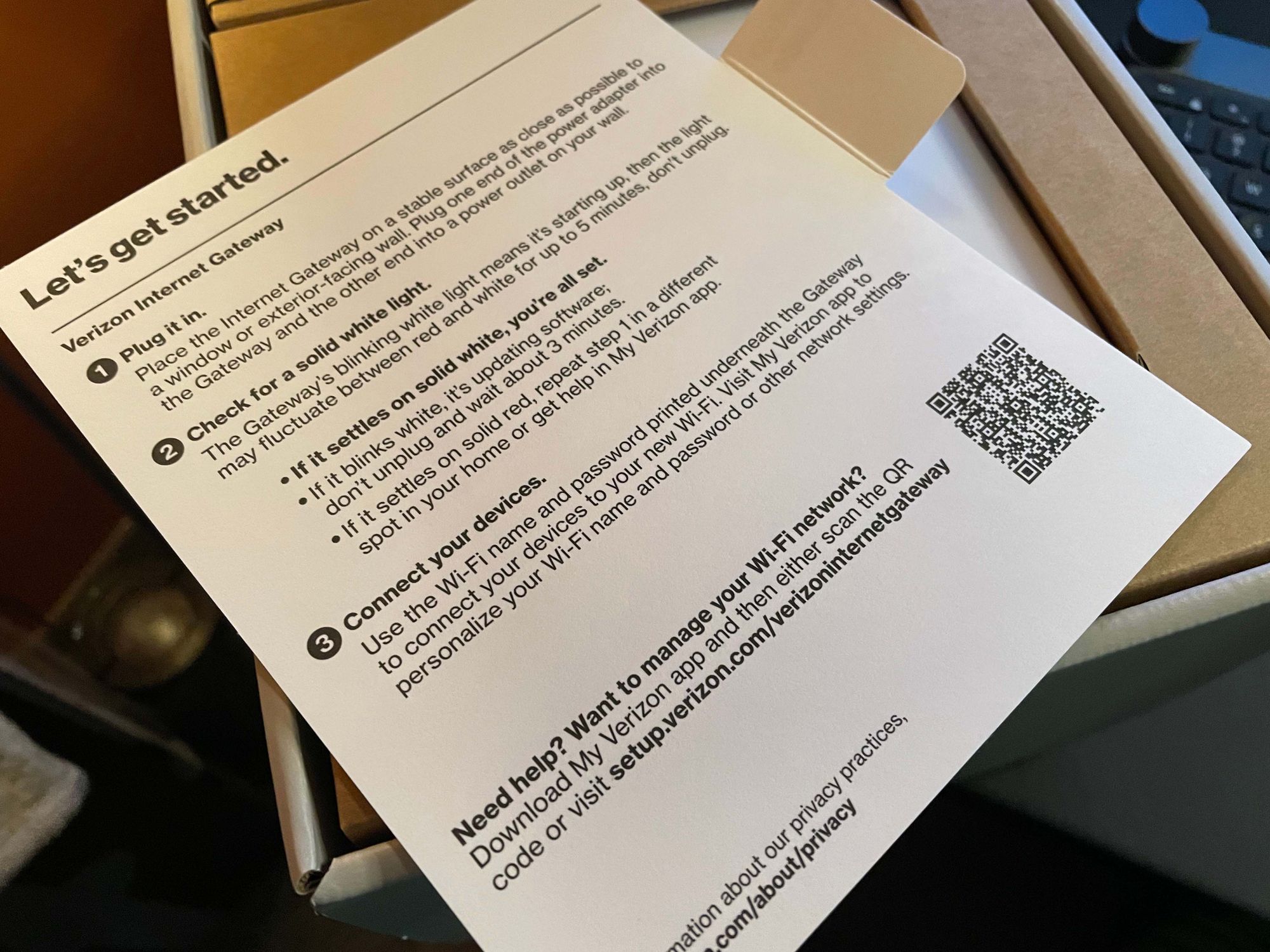 Around 2:00 AM Tuesday after receiving a couple of emails from Verizon indicating my account had been finally set up (no doubt by overnight support staff), I was able to get the Verizon 5G Home Internet Gateway set up in no time.