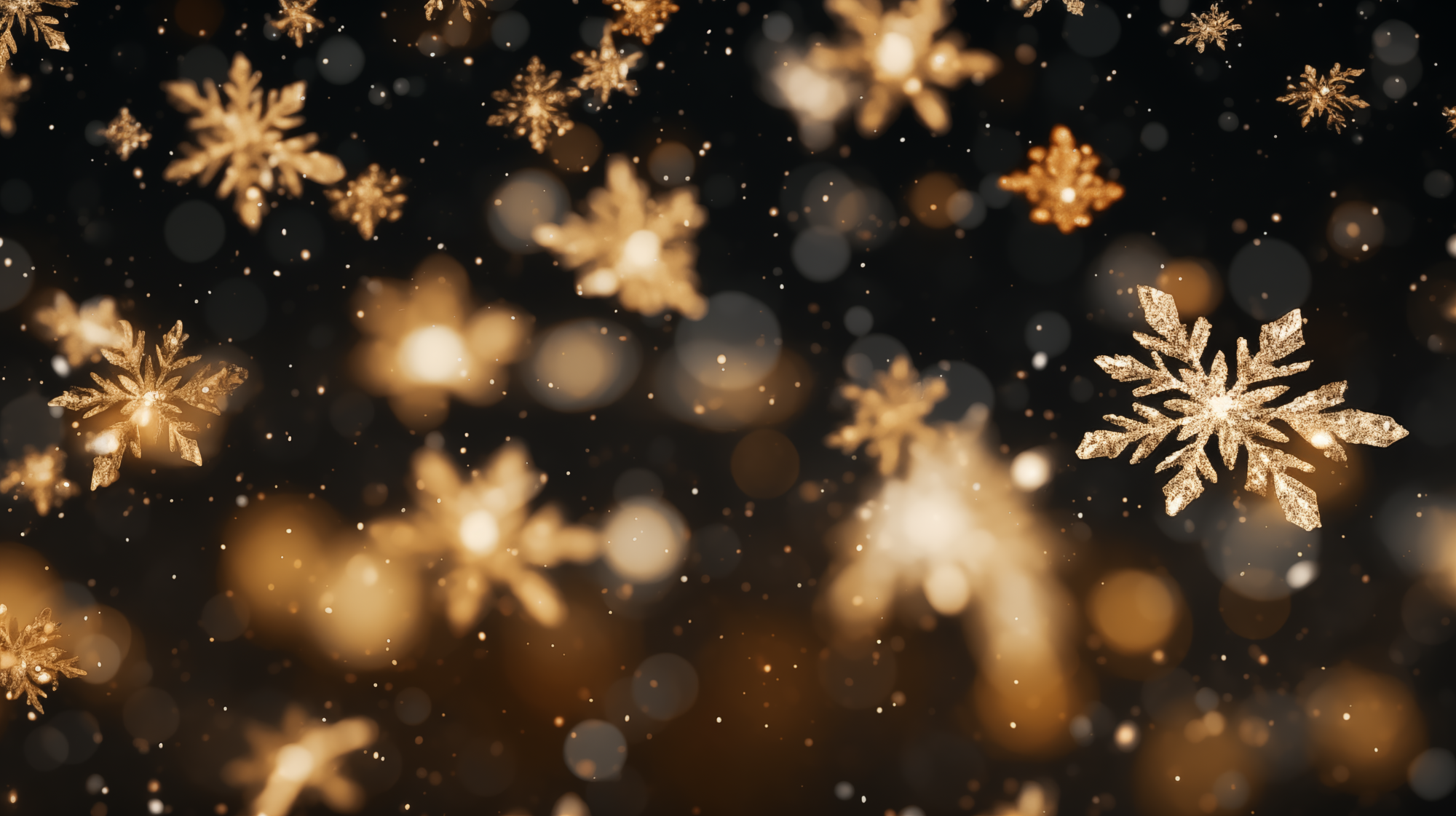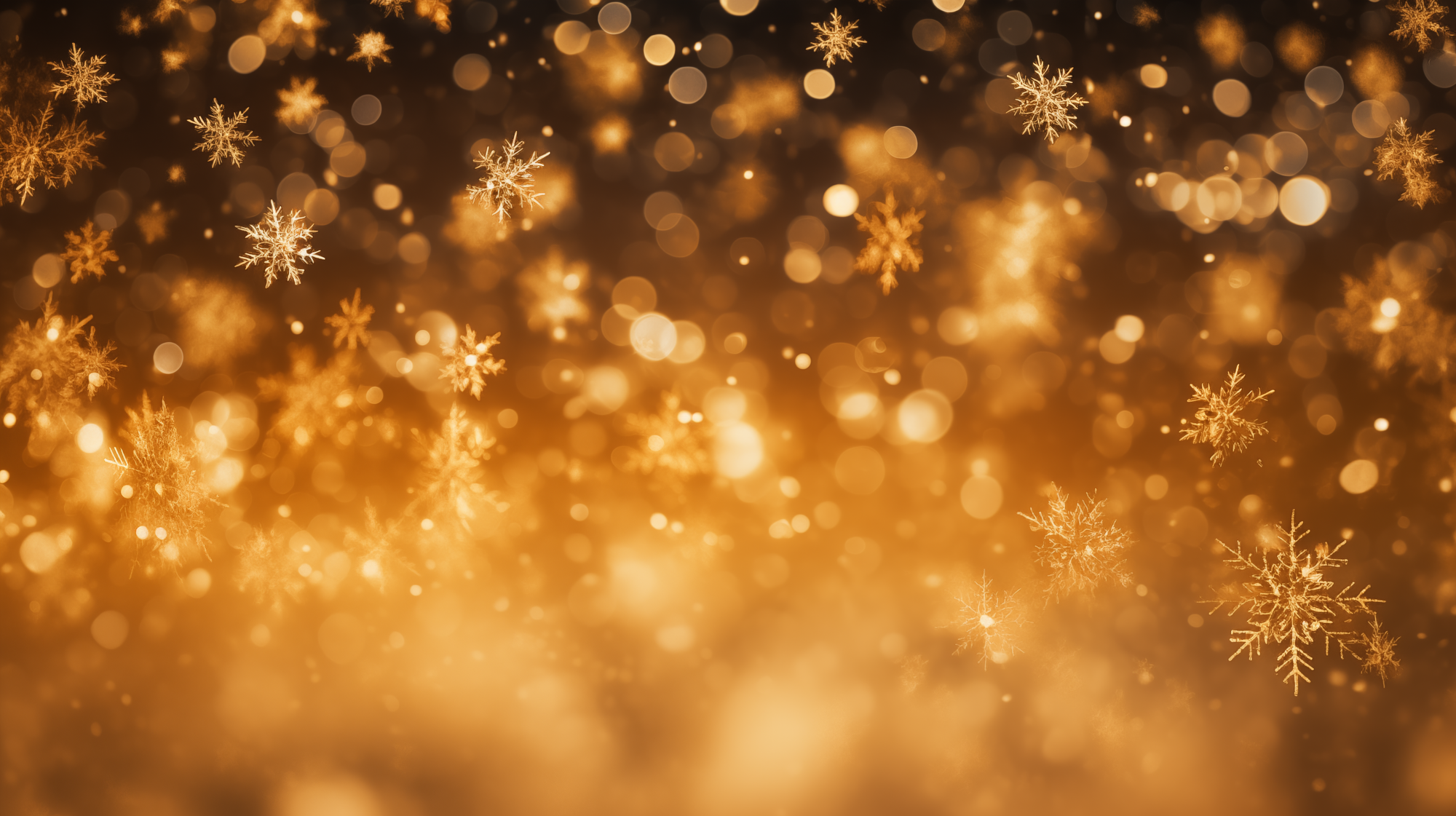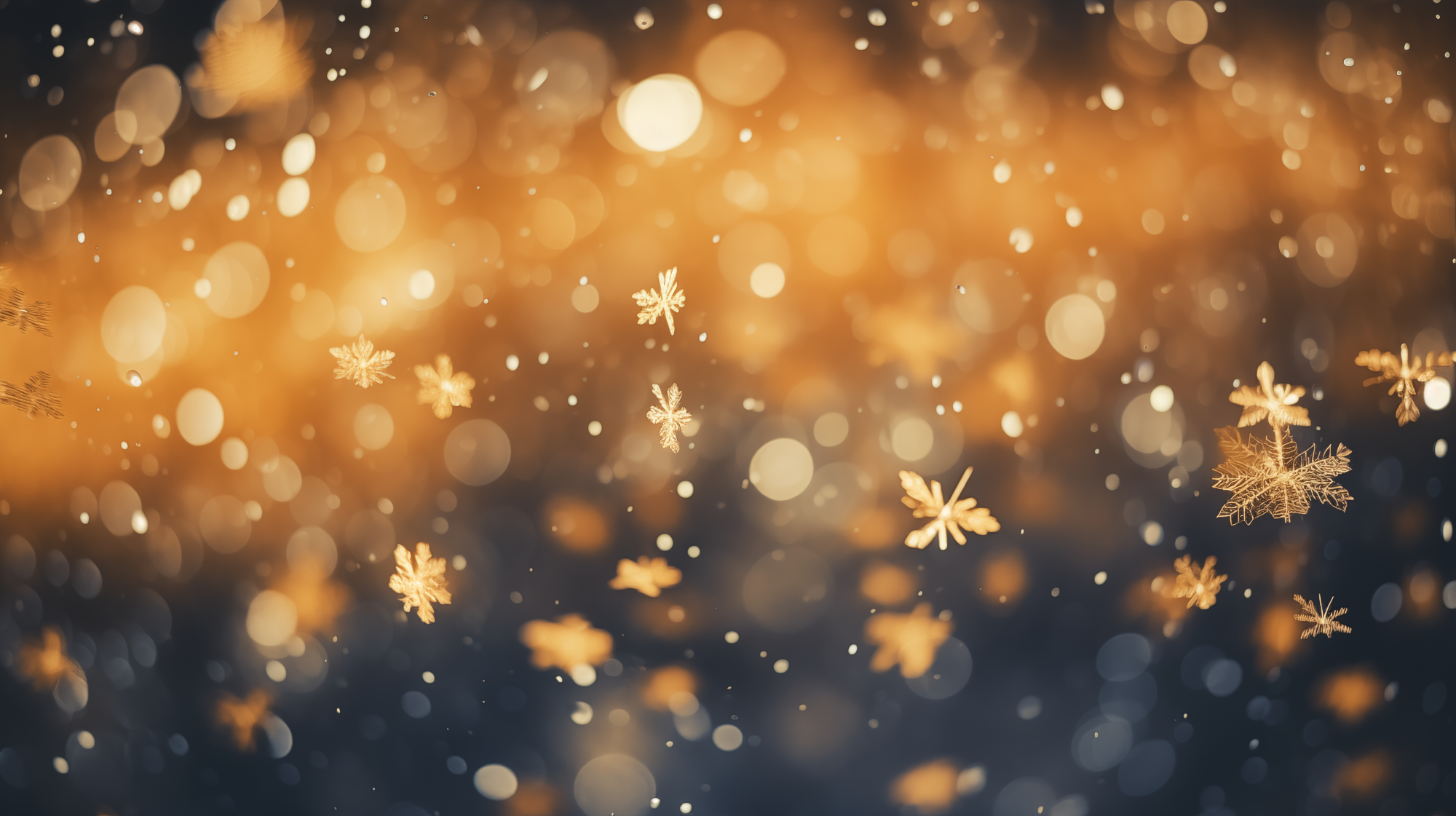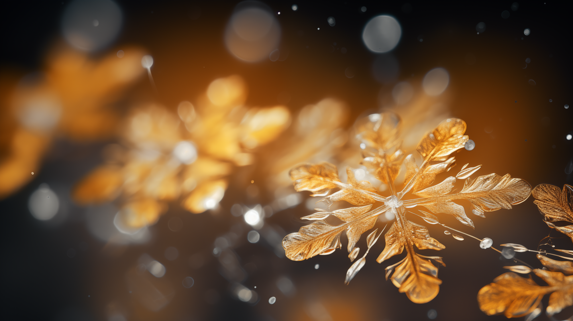 Gold leaf snowflakes falling from the sky at night. In the style of award-winning close-up macro photography. Motion blur, high shutter speed. --ar 16:9 --v 5.2
