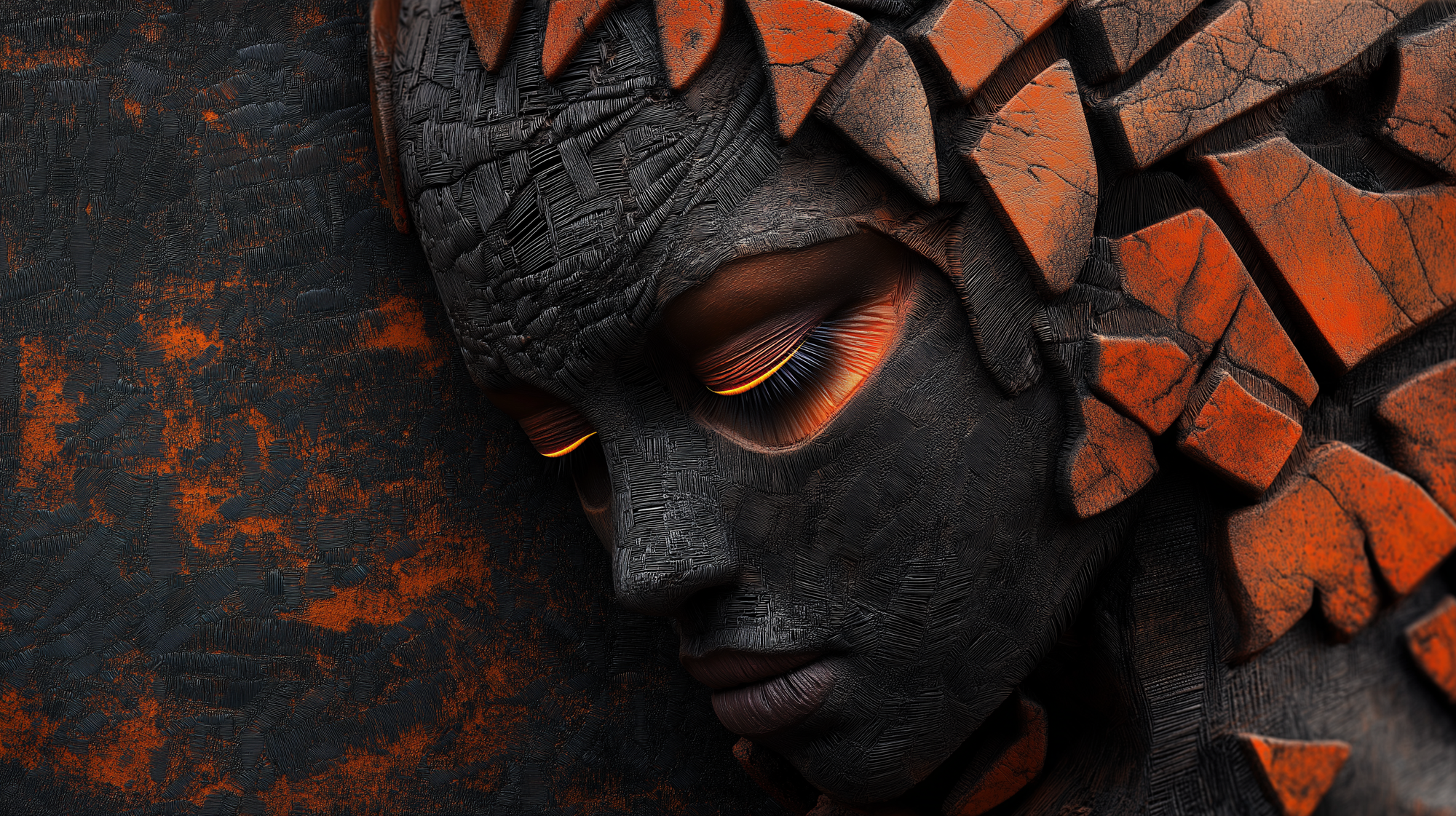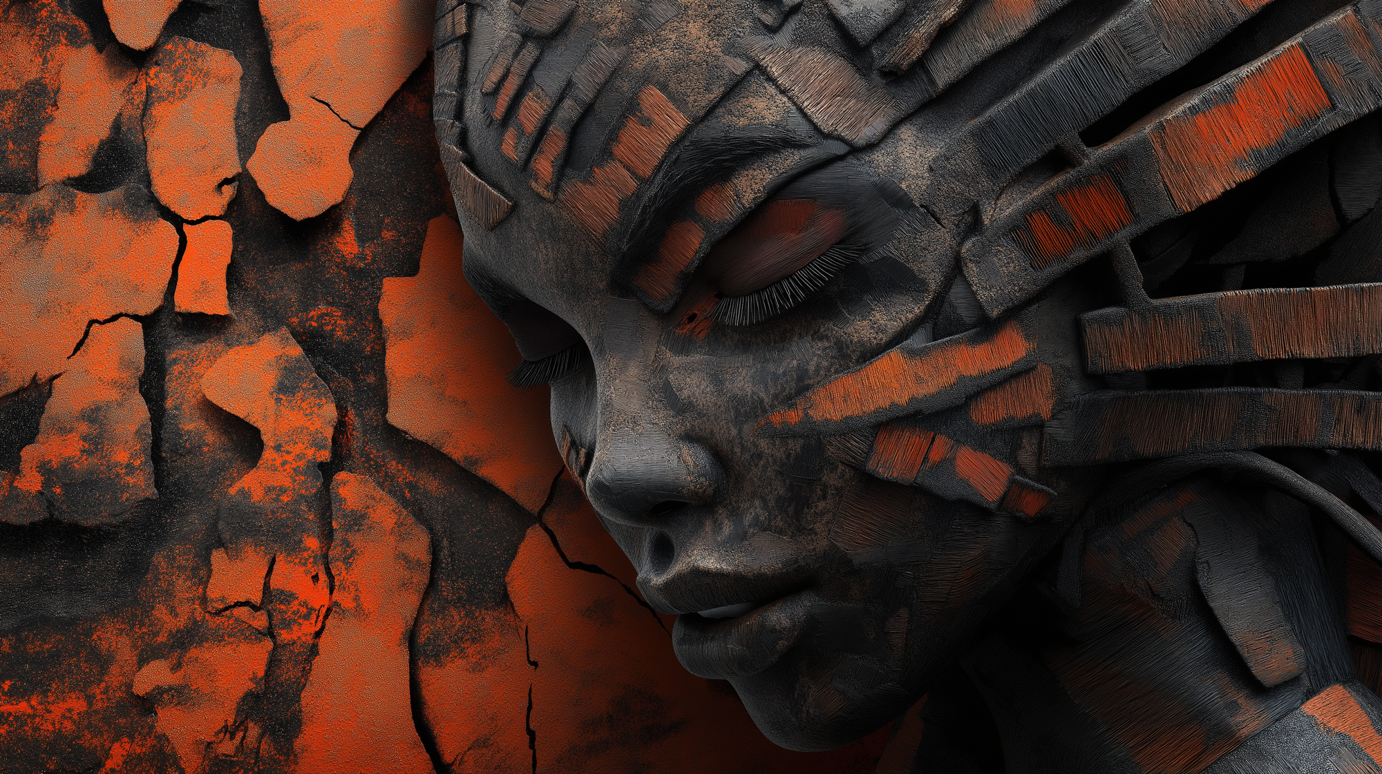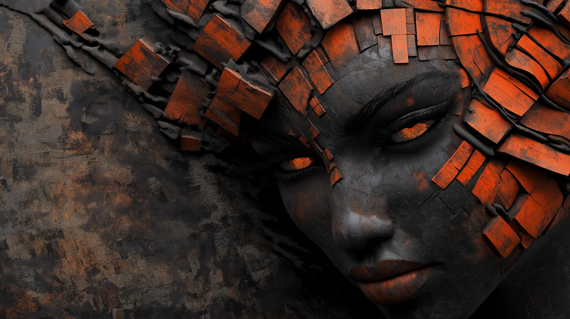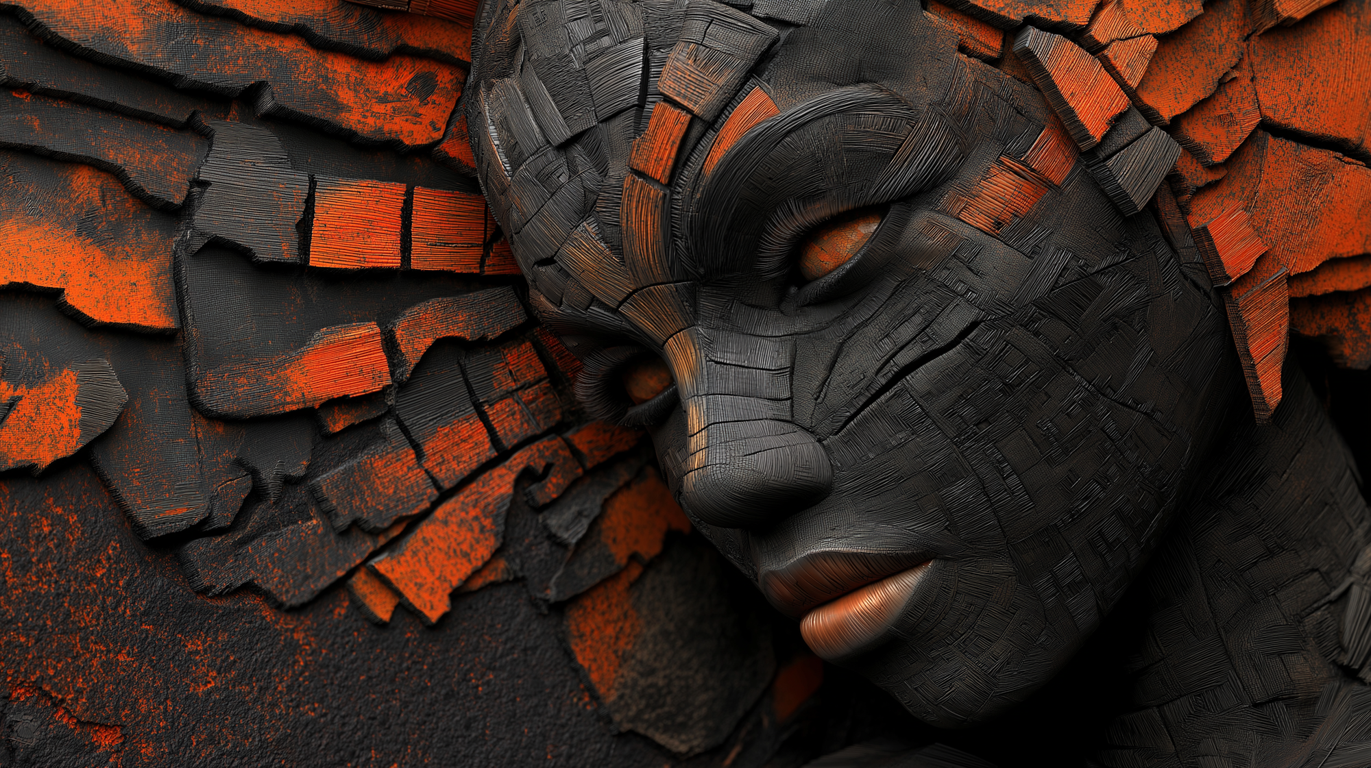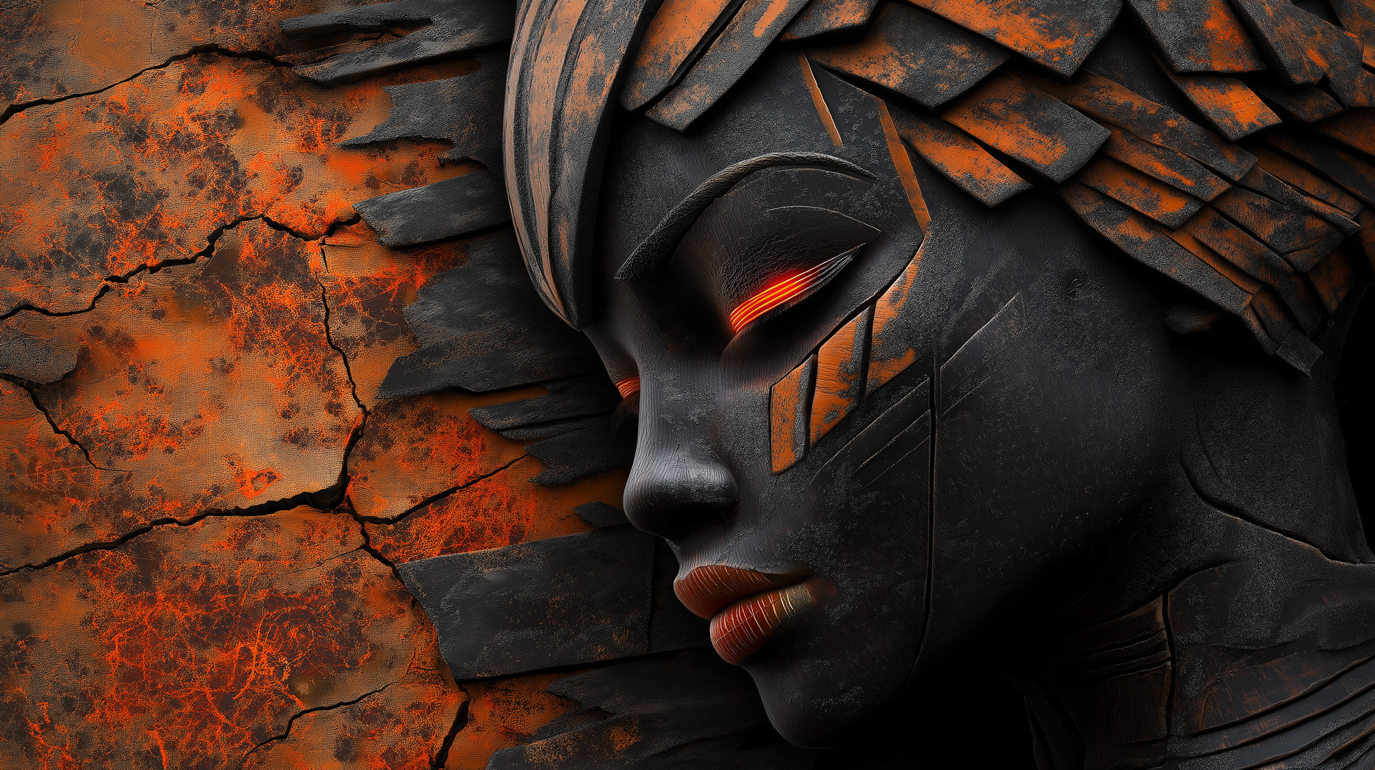Shakka when the walls fell. A fiber optic mozaic story. In the style of unique ancient Nubian wood carvings. --ar 16:9 --profile m4z3rfh --v 6.1